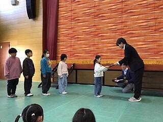 校長先生より、各学年の代表(1組1番)に、修了証が渡されました。
